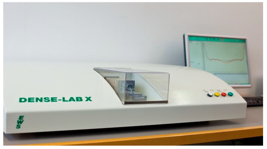 The vertical density profile is generated as result of the input process parameters in hot pressing. Applying pressure on the fiber mat in the presence of a high temperature and the required moisture content creates a vertical density profile. This VDP across the board thickness relates to the bending, internal bonding, and other MDF mechanical properties [22]. An electronic wood X-ray machine as shown in Figure 5 was used to generate X-ray profile of samples used in the experiment. Five work pieces’ samples with dimensions of 50 × 50 mm was considered for the X-ray graph. The X-ray graph represents the point-to-point density as well as the density at the edges and center of the samples [23].