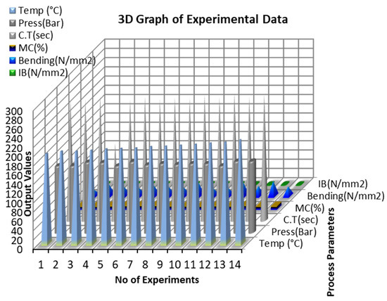From the experimental data presented in Table 2, the input values of pressure, temperature, cycle time, and moisture content are determined based on the output of bending and internal bonding. According to the experimental data, the maximum value of bending is 32 N/mm2, corresponding to the maximum internal bonding of 0.64 N/mm2. These are achieved by applying a pressure of 155 bar with a temperature of 220 °C, cycle time of 265 s, and moisture content of 8%.