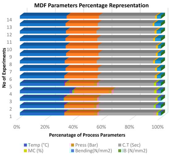 Figure 7 shows the percentage representation of mediumdensity fiberboard parameters. Some of the data are selected from the experimental data in Table 3 for further analysis. To obtain the peak and center densities of the specimen, vertical density profiles are generated.