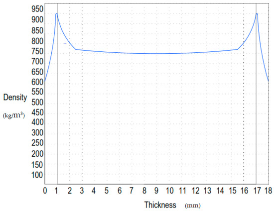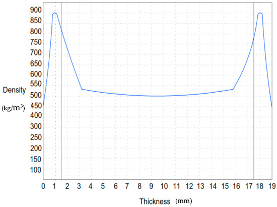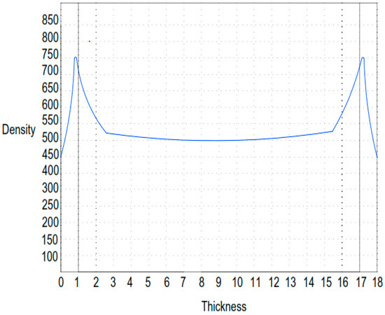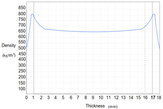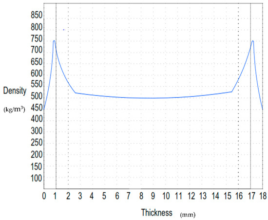 The density profile test illustrates changes in thickness, reflecting the density of the panel. Equal distribution leads to a better quality of medium density fiberboard. The experiment was performed using twelve sample pieces, with six pieces with dimensions of 100 × 200 mm at the left side and six pieces with dimensions of 100 × 200 mm at the right side. The weight and thickness of each work piece were measured to obtain the density profile.