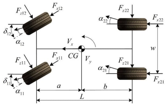 where is the vehicle longitudinal velocity, is the lateral velocity, is the yaw rate, is the longitudinal acceleration, is the lateral acceleration, is the yaw moment, and are longitudinal and lateral forces of the tire (ij is 11, 12, 21, and 22, which represent the front left, front right, rear left, and rear right wheel, respectively), m is the vehicle mass, a is the distance from the center of mass to the front axle, b is the distance from rear axle to the center of gravity, w is the wheel track, L is the wheelbase, is the yaw moment of inertia, and and are the steering angles of the left and right front wheels, respectively.