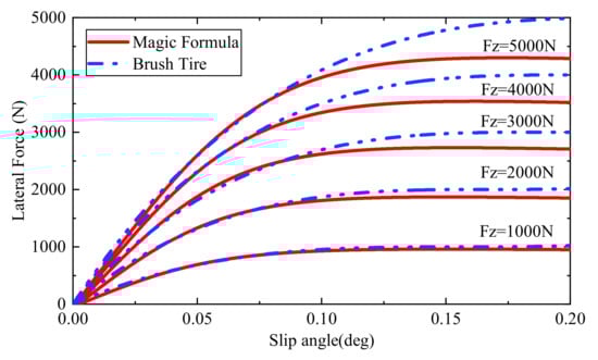 As can be seen in Figure 2, the brush tire model has a high fitting accuracy under the small lateral deflection angle condition, but the peak lateral force of the brush tire model is slightly larger than that of the MF tire model under the large slip angle condition. In this paper, the simulation conditions are low vertical force and lateral slip angle, and the tires are not in the strong nonlinear region, so the brush tire model is chosen to ensure the simulation accuracy. The brush tire model calculation is shown below.