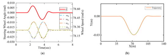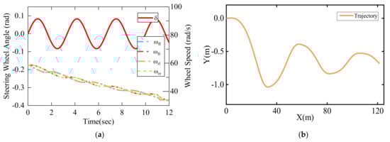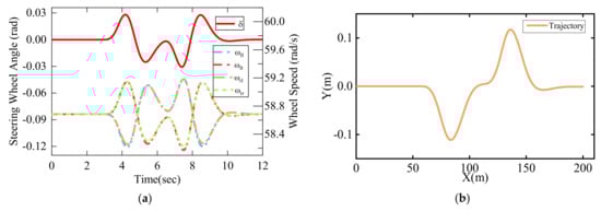 Sinusoidal steering combined with braking conditions: (a) observer input, including front wheel angle and four-wheel speed; (b) vehicle trajectory.