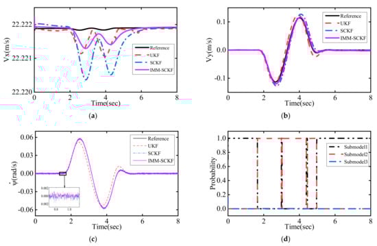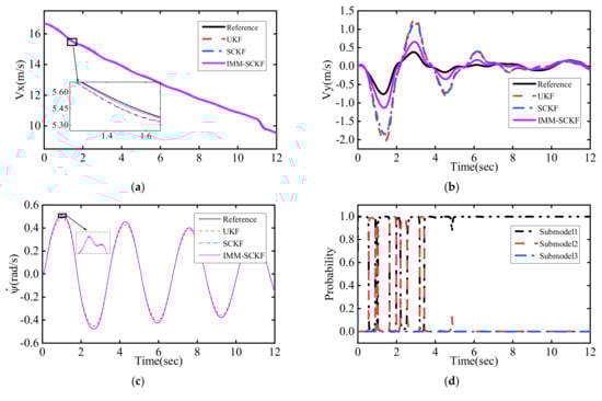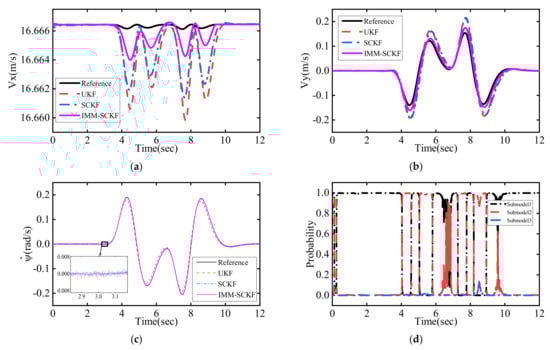 Simulation results of vehicle state under sinusoidal steering condition: (a) longitudinal velocity; (b) lateral velocity; (c) yaw rate; (d) probability of each IMM’s model.