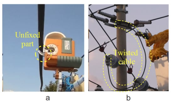 - Wire Stripping: There is a 3–4 mm insulation layer on the surface of a 10 kV overhead cable, which needs to be removed, as shown in Figure 2a.