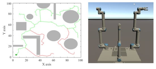 - Versatility: The research in this paper is aimed at a live working environment, and its characteristic is that most of the obstacles are fixed, the positions of a few obstacles are changed, and the target position is also changed. In similar scenarios, the algorithm in this article can be used. For example, in the flexible manufacturing process, tools and parts will change during the production process, but the overall production environment is fixed.