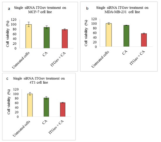 NP-loaded siRNA effect on cell viability against ITGαv single gene after 48 h of MTT assay. CA-siRNA complexes were prepared at 1 mL final volume consisting of 1 nM siRNAs + 4 mM CaCl2 into bicarbonate buffered DMEM (pH 7.4), followed by incubation for 30 min. The prepared complex was transfected for 48 h and absorbance was taken at 595 nm with 630 nm as reference wavelength. Data are shown as mean ± S.D for (a) MCF-7 cells, (b) MDA-MB-231 cells, and (c) 4T1 cells.