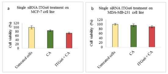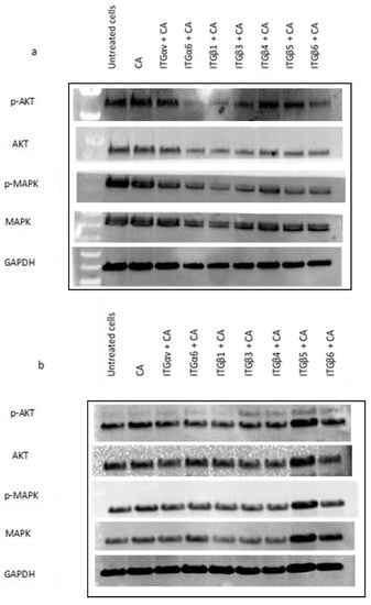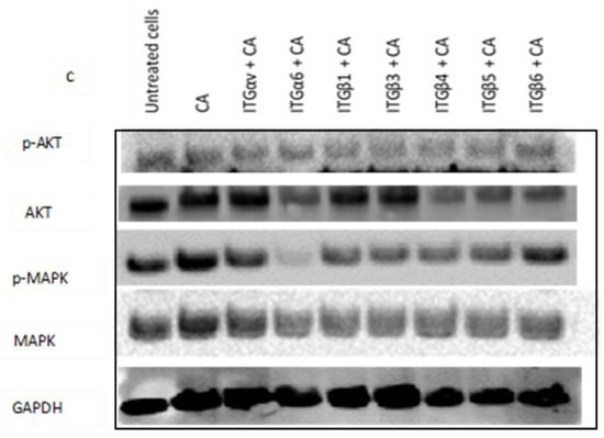 To study whether delivery of single integrin siRNAs loaded with CA-NP in cell lines can regulate the expression of total and phosphorylated AKT and MAPK, we performed Western blot assay. In MCF-7 cells, from Figure 8a we can see the expression of phosphorylated AKT (p-AKT), and total MAPK was significantly reduced in α6, β1, β3, β4, β5, and β6 integrin siRNA treatments delivered using CA complex compared to CA control. The expression of total AKT and phosphorylated MAPK (p-MAPK) was reduced in all the seven treatments.