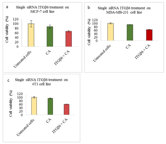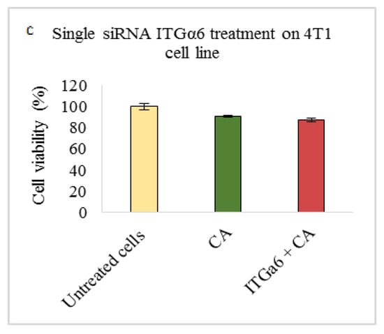 NP-loaded siRNA effect on cell viability against ITGα6 single gene after 48 h of MTT assay. Data are shown as mean ± S.D for (a) MCF-7 cells, (b) MDA-MB-231 cells, and (c) 4T1 cells.