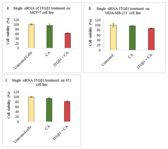 NP-loaded siRNA effect on cell viability against ITGβ1 single gene after 48 h of MTT assay. Data are shown as mean ± S.D for (a) MCF-7 cells, (b) MDA-MB-231 cells, and (c) 4T1 cells.
