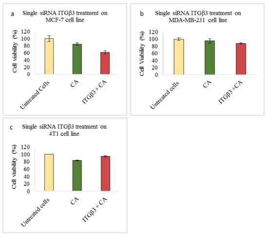 NP-loaded siRNA effect on cell viability against ITGβ3 single gene after 48 h of MTT assay. Data are shown as mean ± S.D for (a) MCF-7 cells, (b) MDA-MB-231 cells, and (c) 4T1 cells.