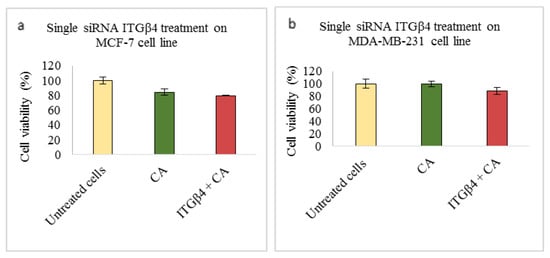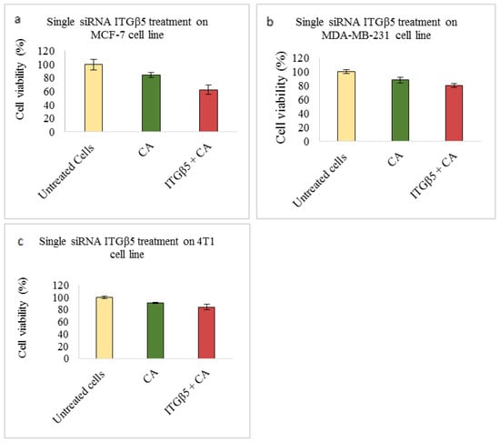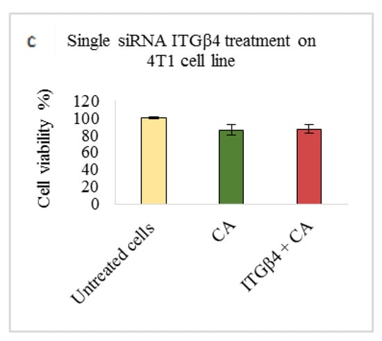 Integrin β5 (ITGβ5), when highly expressed, participates in tumor growth and angiogenesis. After delivering ITGβ5 siRNA along with CA nanoparticles and incubating the cells for 48 h, MTT assay revealed a decrease in cell viability of ~63% in MCF-7 (Figure 6a) with ~21% cytotoxicity (Table 2), ~84% in MDA-MB-231 (Figure 6b) with slight cytotoxicity of ~8% (Table 3), and cell viability of ~84% in 4T1 cells (Figure 6c) with cytotoxicity of ~7% (Table 4). Protein expression was reduced for both phosphorylated and total AKT and MAPK in MCF-7 and 4T1 cells (Figure 8a,c respectively), while in MDA-MB-231 no knockdown was seen (Figure 8b). Variation in the protein expressions may be due to different phenotypic and genotypic characteristics of cells, and while PI3K-ERK serves as one of the pathways which contribute to signaling via this integrin, several other pathways such as Src-FAK, MEK may be involved in regulating the cell viability in MDA-MB-231 cells [28]. At the end of the study, tumor regression showed significant (p < 0.05) reduction in tumor volume compared to CA control (Figure 11), with smaller tumor in comparison with CA control (Figure 12f), indicating successful delivery of target antagonist via CA delivery vehicle. Recent studies have shown integrin β5 contributes to TGF-β-induced EMT and resistance to radiotherapy and chemotherapy in various stages of breast cancer [28]. Therefore, by sequestering this molecule, besides targeting AKT and MAPK oncogenic proliferation pathways, vital EMT pathways could also be affected. Hence, this integrin sub-unit might serve as an efficient therapeutic target in the breast cancers which are resistant to most of the therapies.