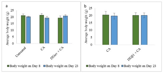 Average body weight of mice on Day 8 and Day 23 of tumor regression for untreated, CA treated and (a) ITGαv + CA (b) ITGβ1+ CA treatment. Data are shown as average body weight of 5 mice ± S.D.