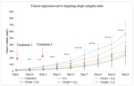 CA loaded siRNA ITGαv, ITGα6, ITGβ5, and ITGβ6 treated group (in folds) with tumor reduction in comparison to CA-NP treatment.