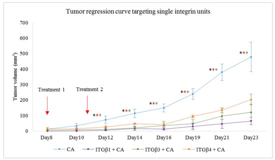 Tumor induced mice were treated intravenously with 100 μL of CA-siRNA(s) formed in 4 μL of 1 M CaCl2 and individual siRNA against ITGβ1, ITGβ3, and ITGβ4 genes. Two treatment doses were given, on Day 8 and on Day 11. A total of 5 mice per group were used and data were represented as mean ± SD. Tumor outgrowth of mice treated with CA-siRNA against ITGαv, ITGα6, ITGβ5, and ITGβ6 genes values are significant for * representing p < 0.05 for ITGβ1 + CA, * representing p < 0.05 for ITGβ3 + CA, * representing p < 0.05 for ITGβ4 + CA.