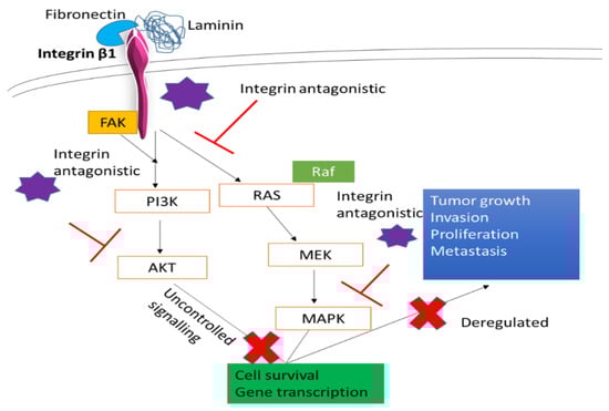 While there are 8 subunits of β integrin which play important roles in cellular processes, integrins such as β1, β3, β4, β5, β6, and β8 have vital role in breast cancer. Each type of β subunits plays a distinct role in breast cancer where they are essentially involved in pro-tumorigenic processes such as epithelial mesenchymal transition (EMT), tumor development, progression, survival, angiogenesis, neo-angiogenesis, inflammation, and metastasis [16,28,29,30,31,32]. For example, the role of β1 integrin based on the type of breast cancer varies, whereby its decreased and increased expression plays essential roles in tumorigenesis. Regular expression of this integrin helps in development of epithelial tissues via cellular proliferation and differentiation, but when overexpressed it can participate in angiogenesis, progression, and metastasis of breast cancer in invasive ductal carcinoma (IDC) [33]. Like α subunit, β subunit also associates with various receptor molecules, modulating different signaling pathways in breast cancer. For example, ITGβ5, which is present in primary and metastatic breast cancer cells, activates TGF-β and ERK signaling pathways via focal adhesion molecules such as focal adhesion kinase (FAK) and paxilin, and epidermal growth factor receptor (EGFR) signaling via proto-oncogene tyrosine-protein kinase (Src), causing tumor cell migration, invasion proliferation, and metastasis [28].