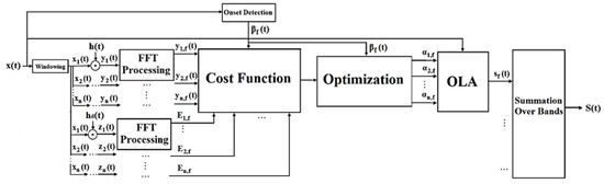 The main objective of the proposed algorithm is to apply a time-varying filtering on a clean speech signal in such a way that after reproduction in a reverberant environment, the temporal envelope in each frequency band is as similar to that of the clean speech signal as possible. For this purpose, a cost function is defined that is optimized. In the cost function, onsets are weighted stronger to ensure accurate reproduction. The time-variant filtering is updated on a frame-by-frame basis. For this reason, the signal analysis, the modelling of the effect of reverberation, and the cost function optimization is done on a frame-by-frame basis. The block diagram of the proposed approach is depicted in Figure 1. It consists of signal windowing and convolving with RIR, preprocessing using the FFT, onset detection, cost function definition, optimization unit, and finally the signal modification unit that is including Overlap–Add (OLA) and summation over frequency bands. After windowing and convolution with RIR, the speech signal is separated into one-third octave bands in the FFT processing unit. To enhance the signal, a frame-based time-varying filter is designed to improve an intelligibility criterion. For a one-third octave band, a cost function is defined and then is optimized to obtain the weights of filter. These time-varying weights are used to synthesize a new speech signal. The parts of this block diagram are explained in detail as follows.