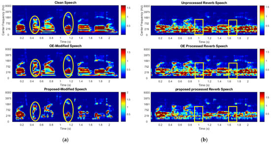 The cochleagram of a clean speech from the OLSA corpus (first raw) and two preprocessed speech signals, one of them preprocessed with the OE algorithm [16] (second raw) and another one preprocessed by the proposed algorithm (third raw), are depicted in Figure 3a.The weights are calculated for room R4. It can be seen that the preprocessing of OE and the proposed algorithm causes a high-pass filter effect on the speech, which is caused by the fact that both enhancement algorithms reduced the amplitude of speech portions with a high and constant energy over time or those which were exposed to a longer (yellow ovals in the left panels). It can be seen that this attenuation is stronger for the proposed method in comparison to the OE. Because of the importance of onsets for intelligibility, and in accordance with Equation (12), onsets are more strongly weighted in the proposed method. The other steady portions, on the other hand, are allowed to be attenuated more in order to minimize the defined cost function.