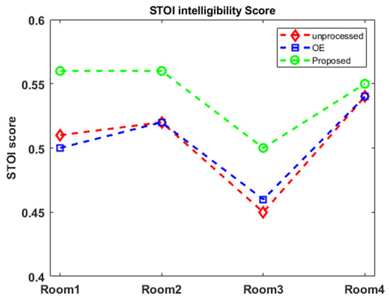 Figure 4 shows the STOI score of the main scenario in each room for reverbed unprocessed, reverbed OE-enhanced, and the reverbed enhanced signal with the proposed algorithm. The OE does not show much difference compared to the unprocessed case, but the improvement for the proposed approach is considerable. The STOI improvement for rooms R1, R2, and R3 is about 0.05. but lower improvement is seen for room R4 with very high reverberation time.