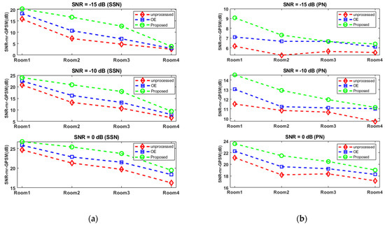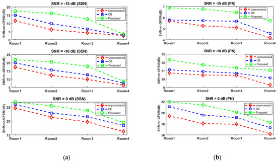 In Figure 7, the SNR-mr-GPSM scores for evaluation of robustness of the proposed algorithm are compared with the unprocessed and OE-enhanced signals. The improvements are in the range obtained for the main scenarios in Figure 5.