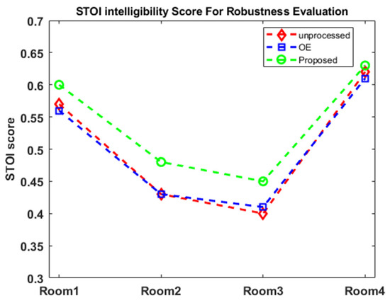 The STOI scores for robustness evaluation scenarios in each room for reverbed unprocessed, reverbed OE-enhanced, and the reverbed enhanced signal with the proposed algorithm. The proposed algorithm similar to the main scenarios in Figure 4 shows improvement for the STOI score in comparison to the reverbed unprocessed and OE-enhanced signals.