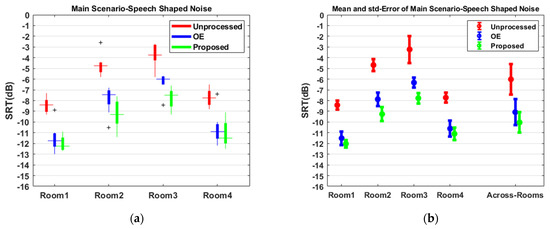 (a) Boxplots of speech reception thresholds at 50% speech intelligibility (SRT50) for 8 subjects, measured in the presence of SSN are illustrated. The unprocessed and the preprocessed signals for the main scenarios using the OE and proposed method are compared; (b) The mean-SRT50 and the standard errors for the same data in (a) are plotted.