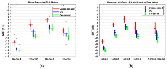 (a) Boxplots of speech reception thresholds at SRT50 for 8 subjects in the presence of pink noise (PN) are illustrated. The unprocessed and the preprocessed signals for the main scenarios using the OE and proposed method are compared; (b) The mean-SRT50 and the standard errors for the same data are plotted.