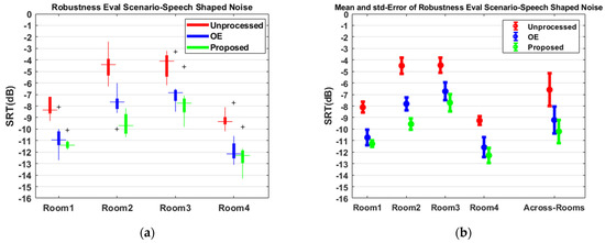 Figure 8 shows the SRT50 for eight subjects obtained with the OLSA matrix test for all four room-acoustical scenarios and SSN for the unprocessed, OE, and the proposed approach. In the left panel, median values are shown together with the 25% and 75% quantiles and outliers across eight subjects. The right panel shows the mean values and the standard error across the subject’s mean values and the standard error at the most right-hand side is calculated across all subjects and rooms. Considering all rooms, it can be seen in Figure 8b that the intelligibility is enhanced up to 3.5 dB for OE and 5 dB for the proposed approach compared to the unprocessed speech. In the rooms R2 and R3, the proposed approach has a slightly larger effect on intelligibility which may be caused by the midrange values of . Data obtained in rooms R2 and R3 for SSN show an improvement of about 1.5 dB and 1 dB for the proposed method in comparison to the OE. The proposed approach shows only a small improvement in Rooms R1 and R4, which is due to the low and very high reverberation times that make more improvements difficult. Room 4, which is a church with a reverberation time of = 5 s, shows no large difference between the proposed and OE approach. For this room, in spite of the higher reverberation time, the SRTs are lower in comparison to that of rooms R2 and R3. This is mainly because of high direct-to-reverberant ratio in the BRIRs of the church and also the larger azimuth angle difference between source and the noise for BRIRs in the church.