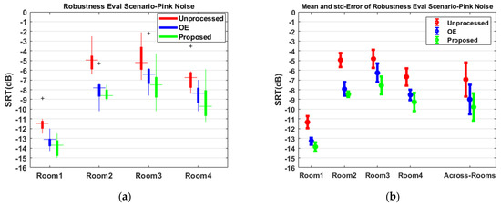(a) Boxplots of speech reception thresholds at SRT50 for 8 subjects to evaluate the robustness of preprocessing methods in the presence of pink noise (PN) are illustrated. The unprocessed and the preprocessed signals for the main scenarios using the OE and proposed method are compared; (b) The mean-SRT50 and the standard errors for the same data in (a) are plotted.