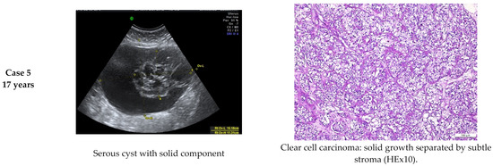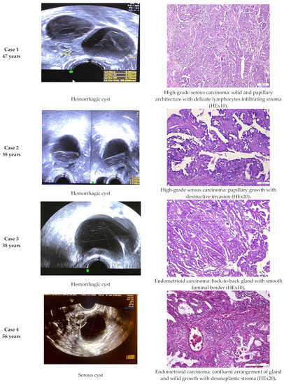 Histologically confirmed malignant tumors were detected in only five (2.17%) cases (two cases of HGSC (high-grade serous carcinoma), two cases of EC (endometrioid carcinoma) and one case of CC-OC (clear cells ovarian carcinoma)) (Figure 2), although the IOTA ADNEX model showed a malignant risk under 3.9% and a borderline tumor risk less than 2.4%. Thus, we obtained 2.17% false negative results for malignancy.