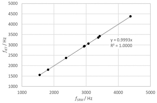 The comparative tests confirmed that SRM and IET are equivalent methods that give identical values of the resonant frequency. This is also shown graphically in Figure 3. The relationship between resonant frequencies measured by SRM and IET for different samples must be presented by the line with a slope = 1. As can be seen, the experimental points are lying on the line with a slope 0.9993 ≈ 1, which confirms the equivalence of the SRM and IET methods. The data for samples 6 and 9 are very close to each other and merge to one point in the graph.