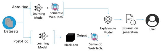 Semantic Web Technologies (SWT) were initially introduced to make the internet data machine-readable by encoding semantics with the data. In the scope of XAI, these techniques can potentially be applied to ML models and are expected to enable the development of truly explainable AI-systems because they provide semantically interpretable tools and allow reasoning on knowledge resources that can help explain ML systems [4,5,6]. They usually are adopted as complementary sources of information that enrich the datasets with semantic knowledge, enabling the exploitation of the relationships between concepts and inferences of new knowledge [1]. There are two main categories of exploration approaches regarding how explanations are generated by considering the part of the machine learning process that is using the semantic resource, namely (1) ante-hoc and (2) post-hoc, as schematically depicted in Figure 1.
