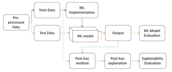 ML process with a training sub-process (black arrows), a testing sub-process (orange arrows), and a post-hoc explanation sub-process (blue arrows).