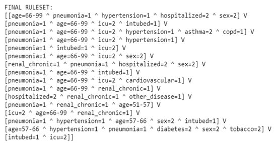 In order to extract rules from the SVM, RIPPER [23] was applied to the dataset with labels predicted by the SVM. This algorithm extracts a rule set for the classification of the COVID-19 mortality class, as depicted in Figure 3. The rule set is composed of disjunctive rules that lead to the classification of the positive class, in this case, mortality. Each line is a rule consisting of a conjunction of clauses. We interpreted the rule set as follows: if the first rule applies to the instance, for example, the patient has an age between 66 and 99 years (age = 66–99), has pneumonia (pneumonia = 1), has hypertension (hypertension = 1), is hospitalized (hospitalized = 2), and is a man (sex = 2), then he will be classified with a high chance of mortality. If the patient did not fit in this first rule, we tried the second, and so on, until the last rule. If none of the rules applied to the patient, he/she has been classified with the negative class, that is, recovery.