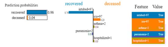 The same explainer used in SP-LIME was applied to generate explanations of specific instances. Figure 4 depicts an explanation obtained with LIME for a single patient, showing the high probability of recovery predicted by the trained SVM and the impact of each variable on each class, with intubation having the highest impact on the classification.