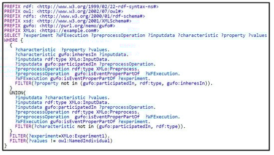 For example, for CQ1 (“Which data were used to train the model?”), Figure 5 shows the SPARQL code used to query the ontology to obtain information about the data used to train the ML model in the first experiment. The same code can be also applied to query the ontology for the second experiment by substituting the value “Experiment1” to “Experiment2”.