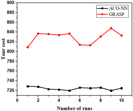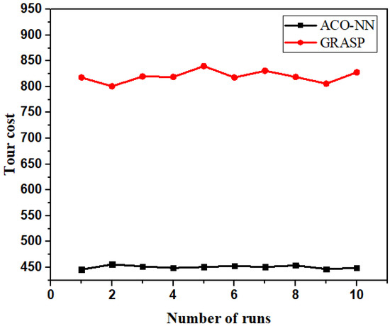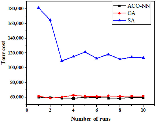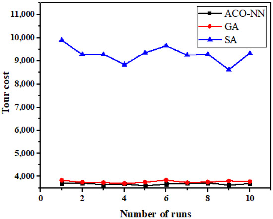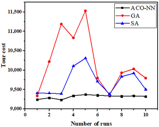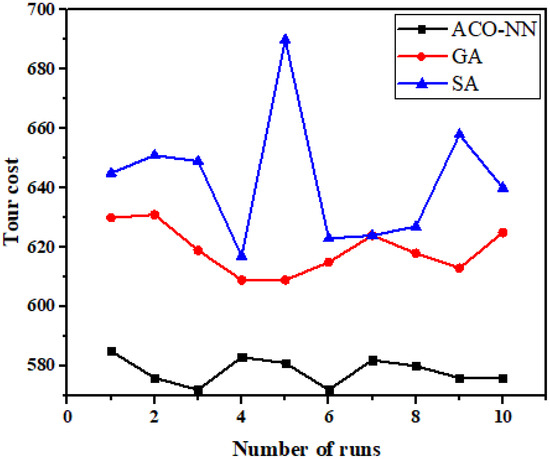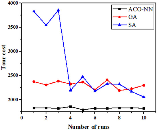 As illustrated in Figure 5 and Figure 6, ACO-NN has minimal tour cost for five data sets with an increase in the number of runs. The performance of ACO-NN and GA is significantly similar for large-scale instances of Pcb442 and Gr666.