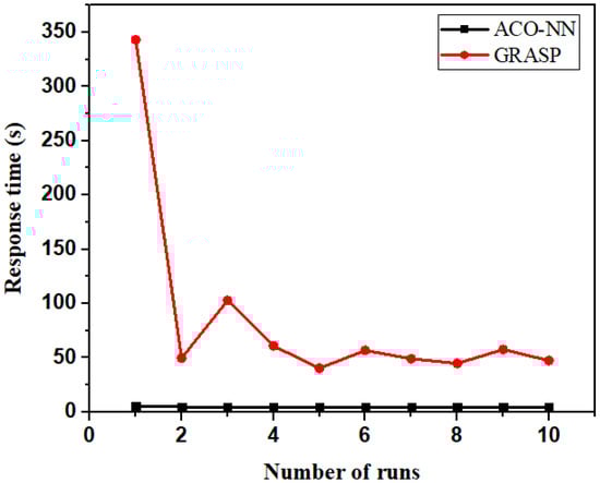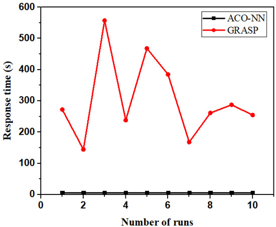 Comparison of ACO-NN with GRASP for St70 regarding response time metric.