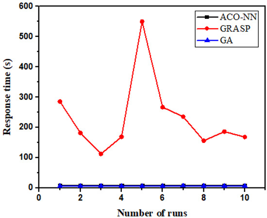 As seen in Figure 12, the results of response time are similar for both algorithms ACO-NN and GA, while the GRASP provides the worst result for the instance KroC100.