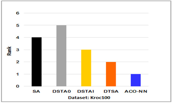 Comparison of rank values for ACO-NN, SA, DSTA0, DSTAI, and DTSA.