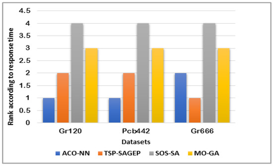 Comparison of rank values for ACO-NN, TSP-SAGEP, SOS-SA, and MO-GA.