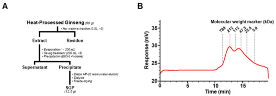 Preparation and molecular weight distribution of heat-processed ginseng polysaccharide fraction (SGP). (A) Extraction and fractionation scheme for preparation of SGP. (B) HP-GPC chromatogram of SGP. Dotted lines indicate the elution time of each molecular weight marker.