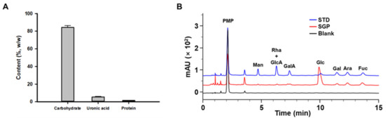 Chemical properties and monosaccharide composition of SPG. (A) Total carbohydrate, uronic acid, and protein levels in SGP. Bars indicate means ± standard deviation. (B) Overlaid chromatogram of PMP-labeled standard and SGP. (Ara, arabinose; Fuc, fucose; Gal, galactose; GalA, galacturonic acid; Glc, glucose; GlcA, glucuronic acid; Man, mannose; Rha, rhamnose).
