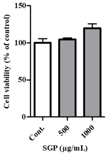 RAW264.7 macrophages were grown in 96-well flat-bottomed microplates (1.0 × 105 cells/well). SGP was diluted using culture medium (500 and 1000 µg/mL), and the cells were treated for 24 h. Cell proliferation was investigated with Ez-Cytox solution. Briefly, the Ez-Cytox solution was added into each well and reacted at 37 °C for 30 min. Absorbance was observed with a microplate reader at 450 nm.