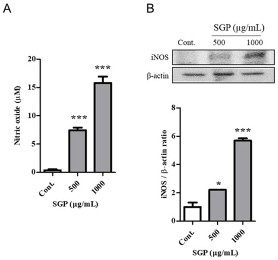 Effects of SGP on NO and iNOS levels in RAW264.7 macrophages. RAW264.7 macrophages were inserted into 500 and 1000 µg/mL SGP for 22 h (for NO) or 18 h (for iNOS). After 22 h, cell supernatants were used for NO production analysis. Supernatants were used according to the Griess method (A). After 18 h, cells were collected to evaluate iNOS protein levels; expression levels were determined through immunoblotting and quantification of iNOS/β-actin intensity (B). Shown are the means ± SD of triplicate experiments. * p < 0.05 and *** p < 0.0001, compared to the controls.