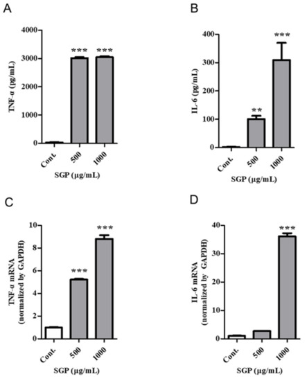 Effect of SGP on cytokine production and mRNA levels of IL-6 and TNF-α in RAW264.7 macrophages. RAW264.7 cells were stimulated with SGP at 500 and 1000 μg/mL for 24 h. Production of IL-6 and TNF-α was determined using an ELISA (A,B). RAW264.7 cells were stimulated with SGP at 500 and 1000 μg/mL for 12 h, and IL-6 and TNF-α mRNA levels were determined using RT-qPCR (C,D). Shown are the means ± SD of triplicate experiments. ** p < 0.001 and *** p < 0.0001, compared to the controls.