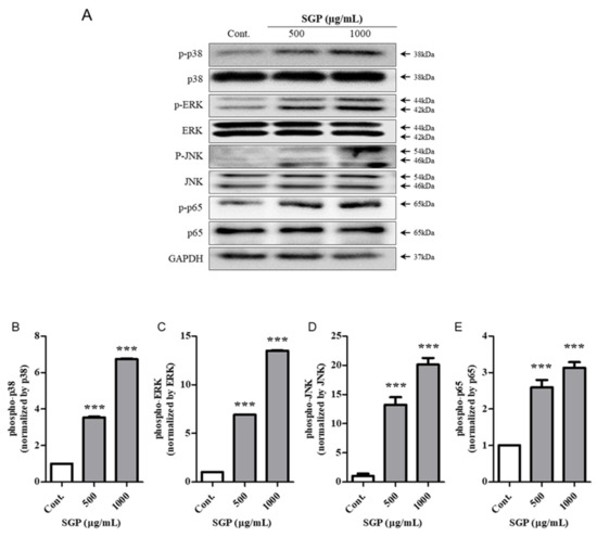 Phosphorylation of MAPKs and NF-κB through SGP stimulation of RAW264.7 cells. RAW264.7 cells were stimulated with SGP (500 and 1000 µg/mL) for 30 min. Phosphorylation and total protein detection of ERK, JNK, p38, and p65 from cell lysates prepared from SGP-stimulated RAW264.7 cells were calculated by phosphor-specific or total protein antibodies. Phosphorylation or total protein levels of ERK, JNK, p38, and p65 (A). Quantification of p-ERK/ERK, p-JNK/JNK, p-p38/p38, and p-p65/p65 intensity (B–E). Shown are the means ± SD of triplicate experiments. *** p < 0.0001, compared to the controls.