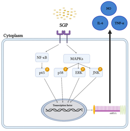 Schematic diagram of MAPKs and NF-κB signaling pathways on SGP treatment in RAW264.7 macrophages.
