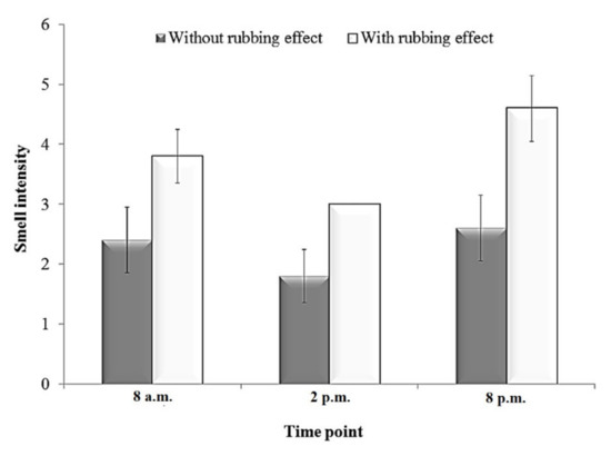 Figure 2. Effects of rubbing on the level of scent emitted by the leaves of Plectranthus amboinicus detected at a distance of 5 cm from the human nose. Scent intensity was evaluated based on a scale that ranged from 0 to 6, with 6 as the strongest and 0 as no scent detected.