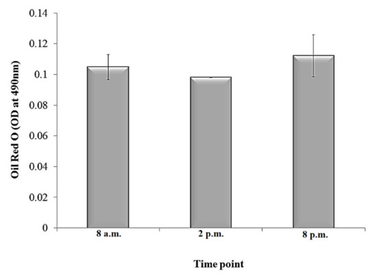 For the quantification of lipid accumulation, an optical density (OD) assessment was conducted to measure the intensity of the red pigment in the leaf, representing the proportion of the essential oil in the tissue sample at the specific time points. In brief, the leaves from three designated time points (8 a.m., 2 p.m., and 8 p.m.) were stained with the Oil Red O. Each stained leaf was cut, rinsed with 0.3 mL of 60% (v/v) isopropanol, and then placed inside a 2 mL Eppendorf tube. Then, 150 μL of absolute isopropanol was added to the tube and vortexed for 30 min. Next, 100 µL of the extract was aliquoted into a 96-well microtiter plate. The OD was measured to quantify the intensity of the extracts at 490 nm using an ELISA plate reader (Bio-Tek Instruments, Winooski, VT, USA). One hundred percent isopropanol was used as a blank. The experiment was performed in triplicate.